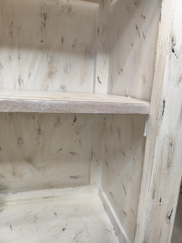 Coloris: Patiné main, pièce unique. blanc vieillissement prononcé teinte de gris, bleu, marron finition satinée